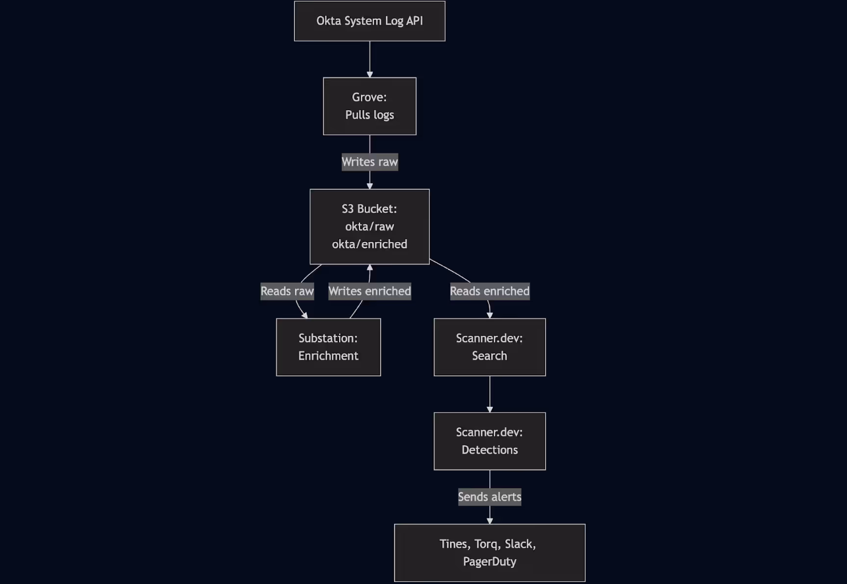 Okta logs are one of the richest sources of security signals. By combining Grove for collection, Substation for enrichment, and Scanner for real-time detection, teams can treat identity telemetry like first-class data: structured, actionable, and continuously monitored.
