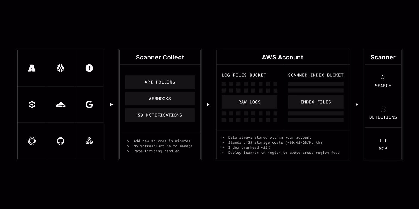 Your logs stay in your S3 buckets. Scanner adds lightweight indexes for instant search. No data leaves your environment.