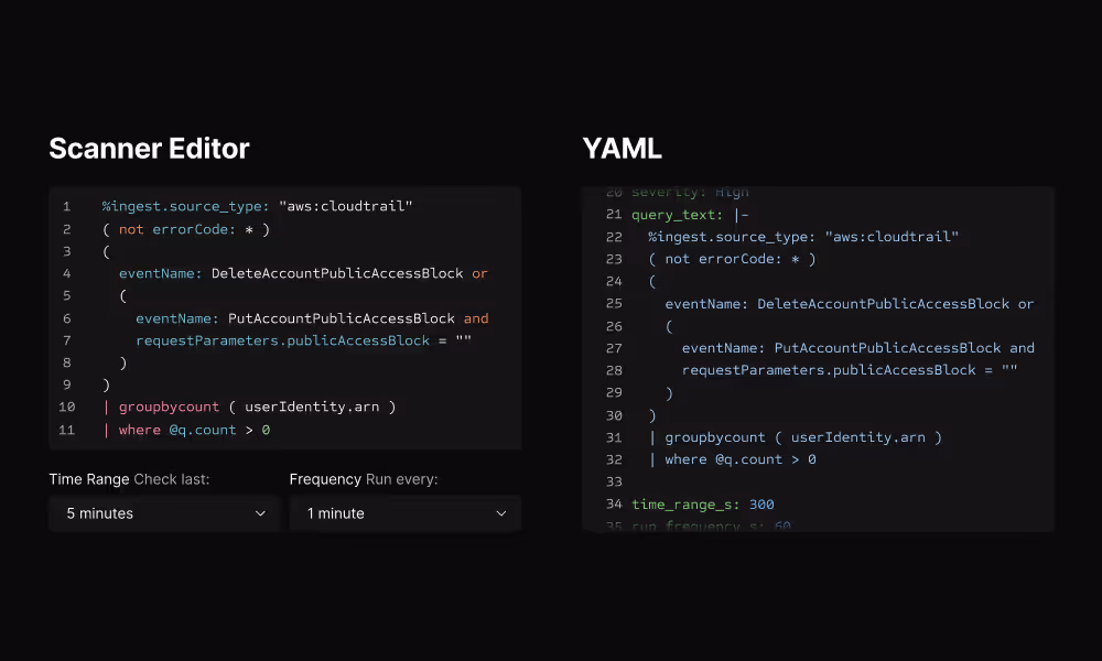 Create rules from scratch in the Scanner UI, duplicate and modify existing OOTB rules, or write rules in YAML and version control them in GitHub. Use the same query language you already know from search.