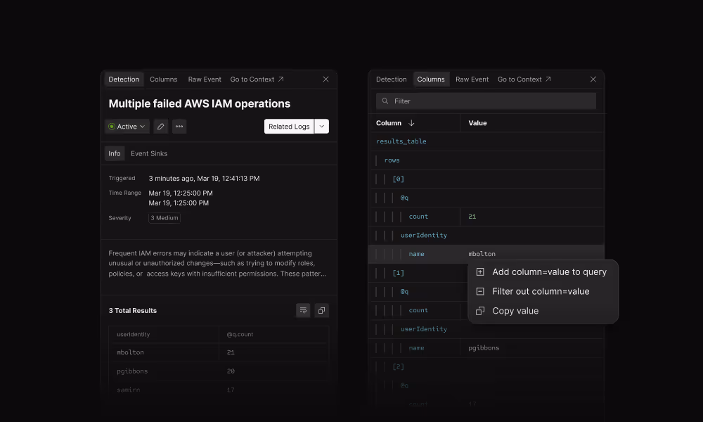 Click any field value to investigate further—see all related activity from that user or IP, filter to similar events, or jump straight to raw logs. Investigation happens in the same tool where the alert fired.