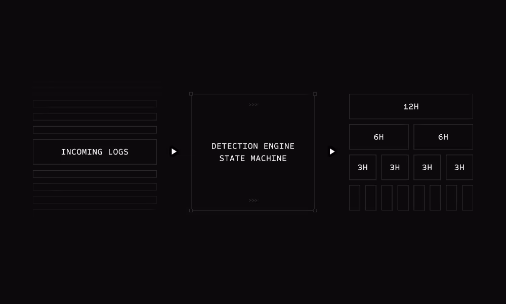Detection rules run during indexing. Logs are processed against all rules simultaneously. Matching logs execute up to their first aggregation, and results are cached in a time-based rollup tree in S3.