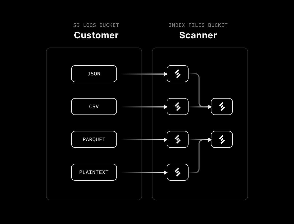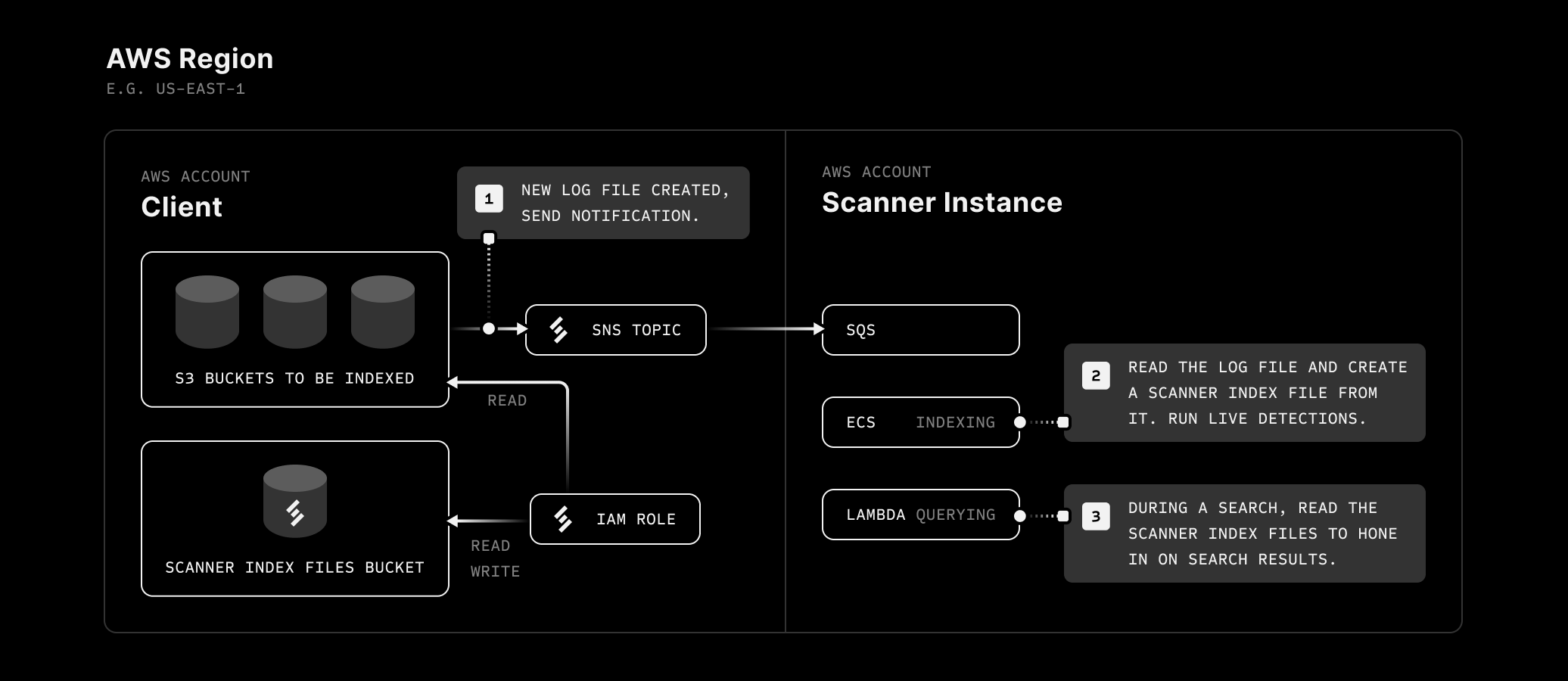 Once the setup is complete, Scanner starts monitoring the raw log data in your S3 bucket. When new log data files are uploaded, Scanner is notified via SQS messages, which enables the indexers to begin their work immediately. The Scanner indexers are optimized to run in the same AWS region as your S3 buckets, which means that there are no S3 data transfer costs while minimizing latency.