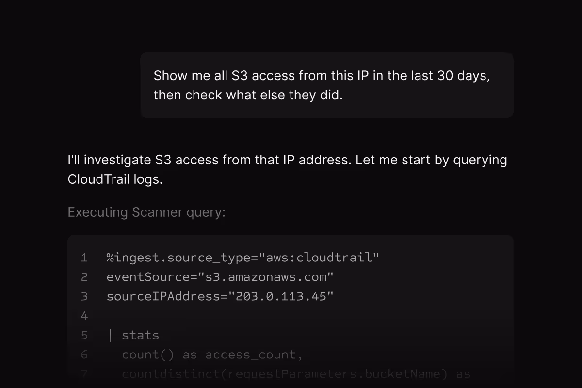 Traditional SIEMs can't handle AI workloads. Queries are too slow and too expensive for agents to explore freely. Scanner is the only security data lake with the speed and economics to make AI-driven security actually viable.