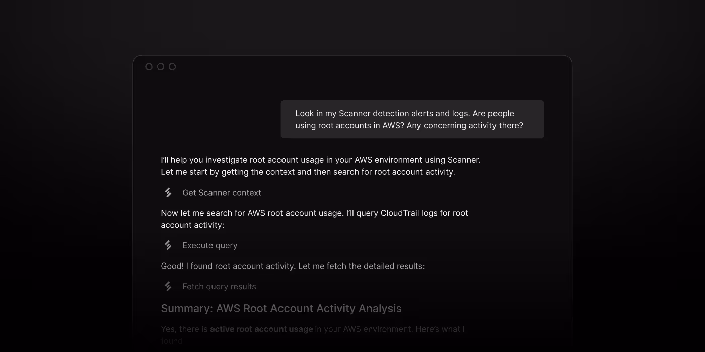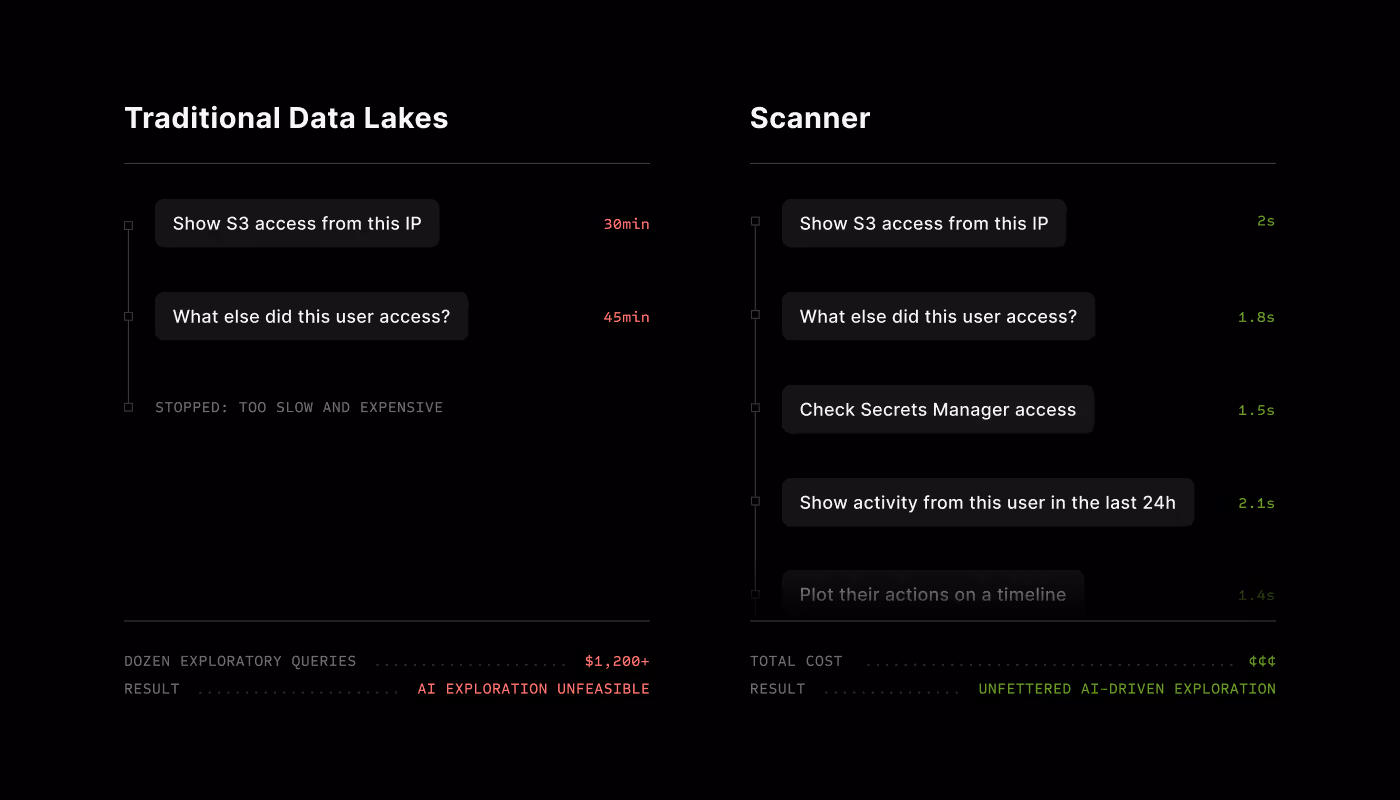 Scanner's sub-second queries let AI agents iterate freely, running 20+ queries in the time traditional systems complete one.