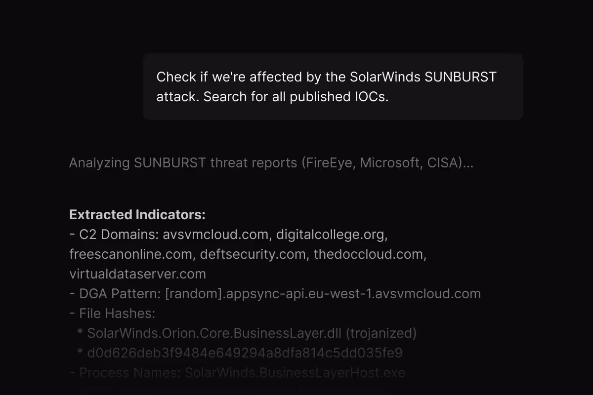 "Check if we're affected by [breach report URL]." AI extracts IOCs, searches 3 years of logs across all sources, correlates findings, and generates impact assessment—fully automated.