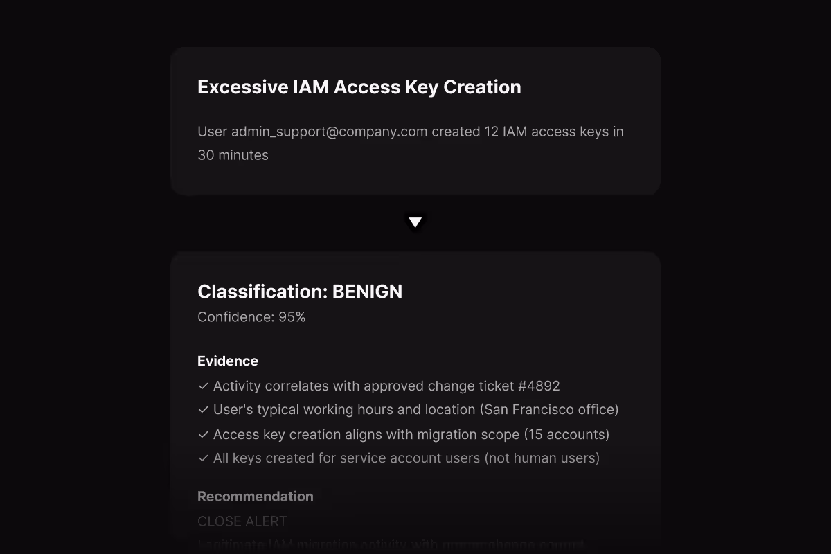 AI agent reads alert, queries related logs, checks past investigations for context, and generates triage report. Escalates high-confidence threats, suppresses known false positives.